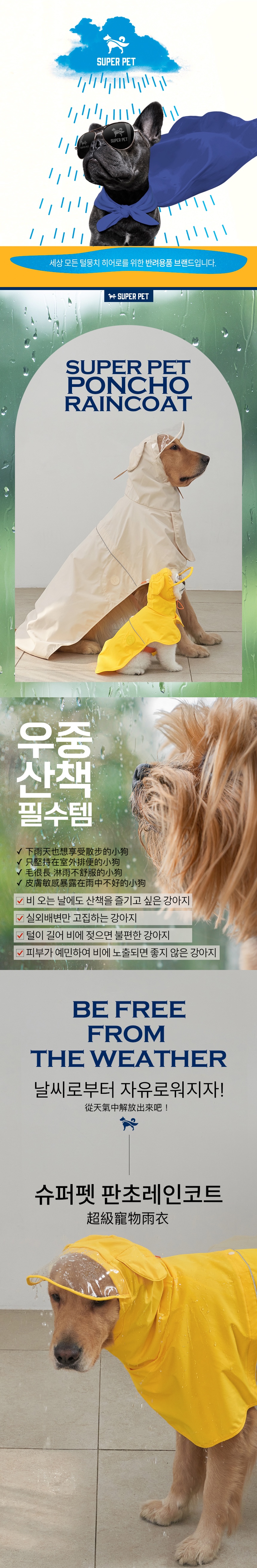 *預購產品 韓國🇰🇷直送✈️ 付款確認訂單後10個工作天左右到貨 SuperPet 🇰🇷 狗狗主人親子裝雨衣,讓你在下雨天也能和你的狗狗成為最吸睛的焦點! 親子設計:讓你和你的狗狗可以穿著同款雨衣 完美防水:在縫線上再用防雨絲線膠帶完美阻擋雨水 細心設定:罕有耳罩設計,讓狗狗帶上帽後亦能清楚聽見 實用所需:配合頸圈和胸帶而設的項圈孔 / 胸帶孔 夜行安全:反光條令夜行時安全可見 輕量舒適:備有調整鬆緊扣,扣子藏在口袋裡,穿著舒適 易於穿脫:後腿設有固定帶,固定雨衣不會脫下來 時尚外觀:簡約時尚,讓你和你的愛犬都成為最吸睛的焦點 易於清潔:方便清潔,不易產生異味。